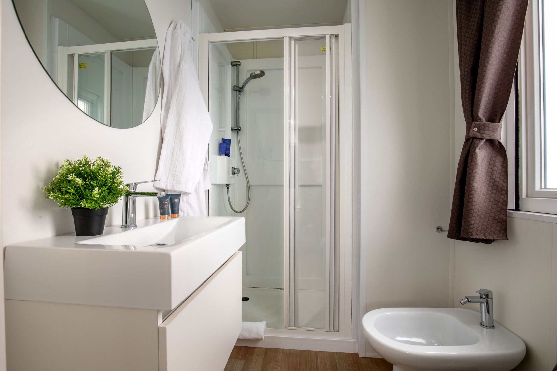 - Main bathroom with shower, sink, bidet, and toilet