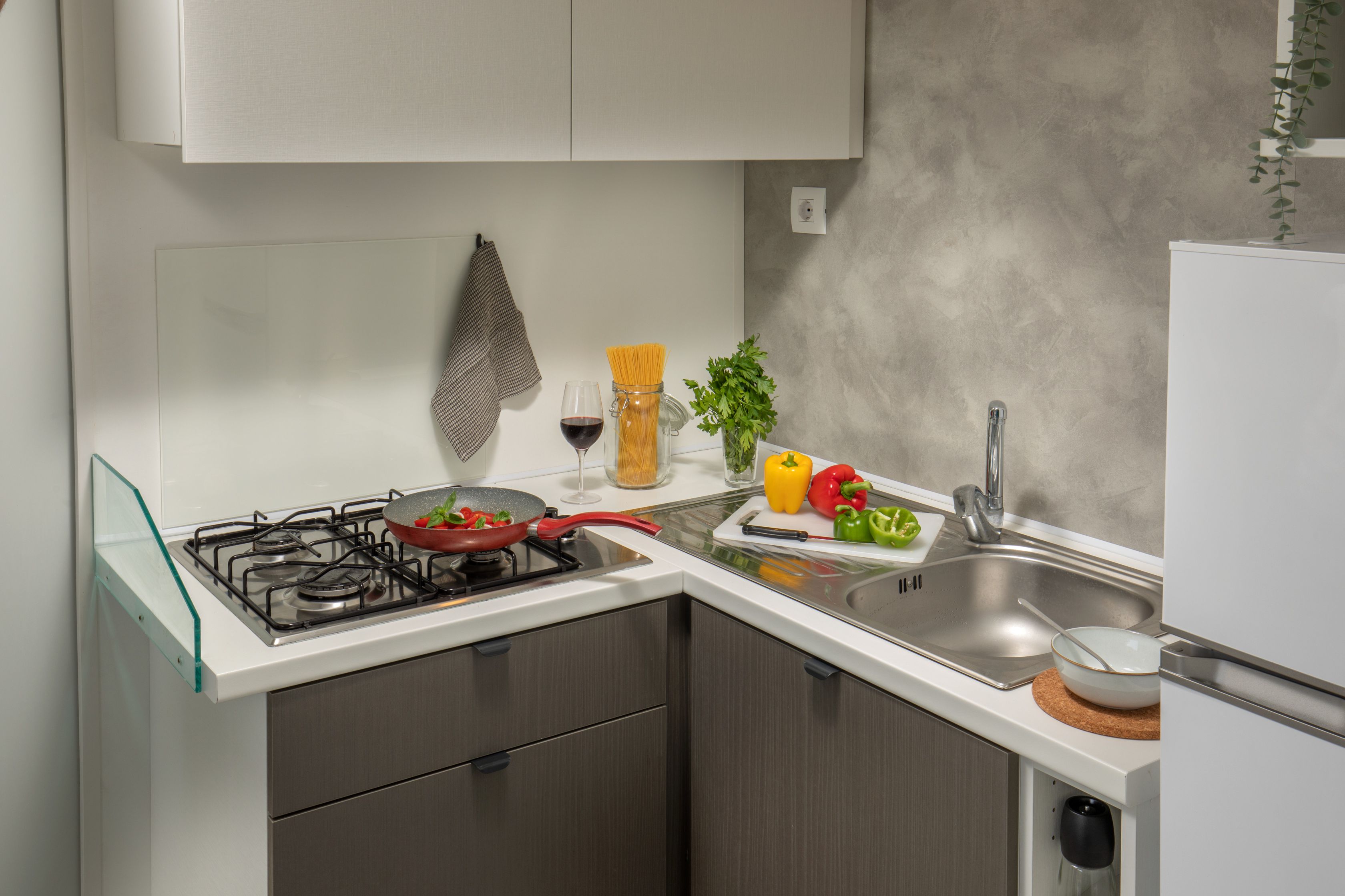 - Living room with sofa bed, kitchenette, sink, and refrigerator